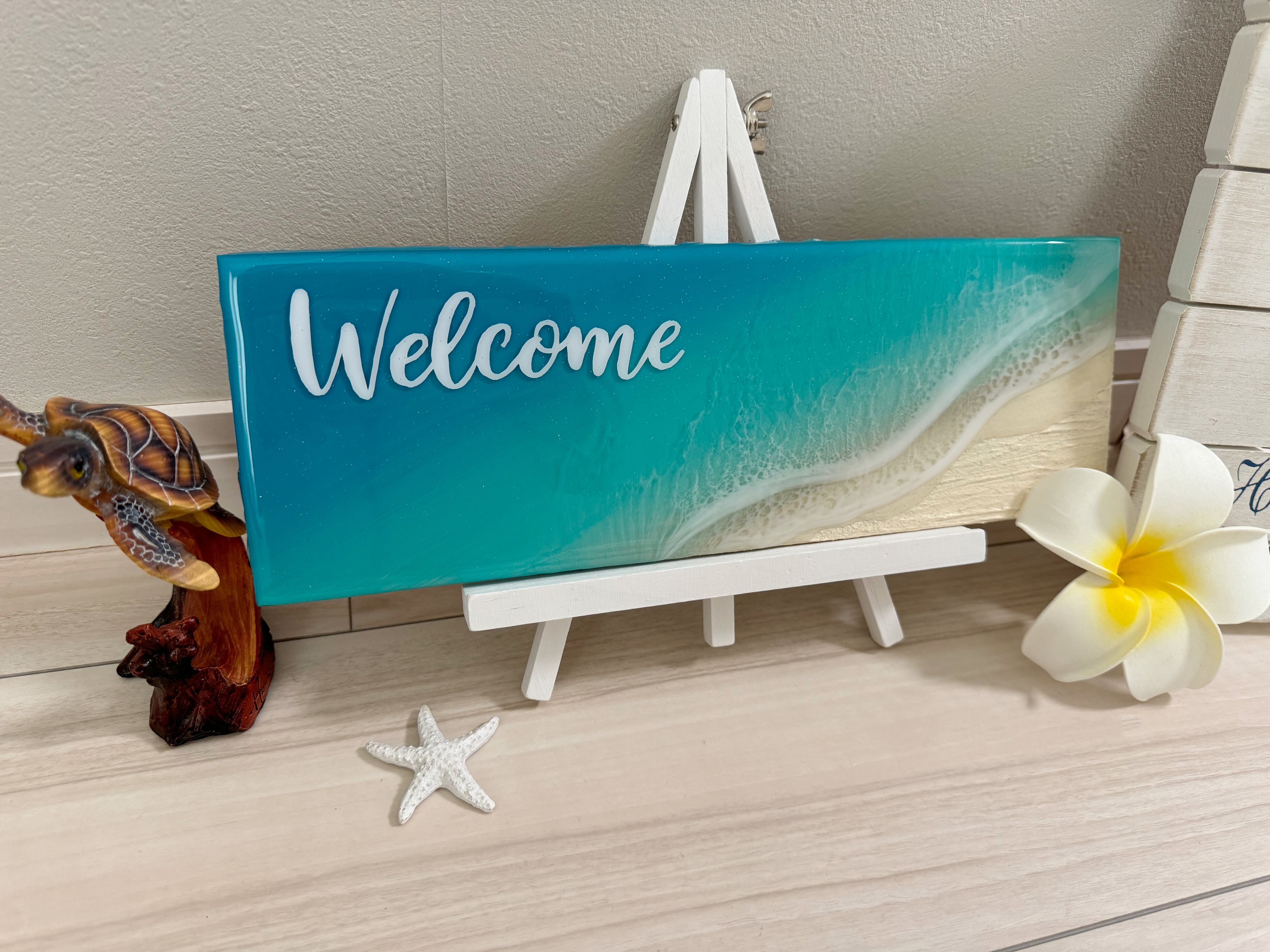 材料:エポキシレジン、アクリル絵の具、MDFパネル、シュプリームホワイト、ラメパウダー、テクスアジェル、カッティングステッカー